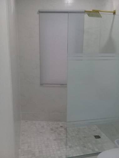 The apartment features air conditioning, a TV, a fully equipped kitchen with a stovetop, and a bathroom with a shower.